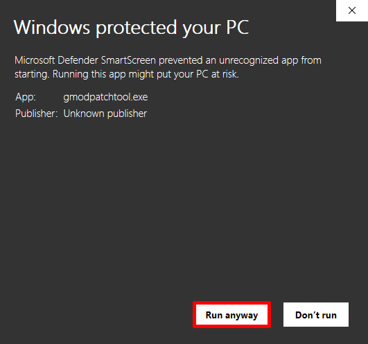 Extract (unzip) GModPatchTool-Windows.zip, then run gmodpatchtool.exe. You may have to allow the app through Windows SmartScreen.
